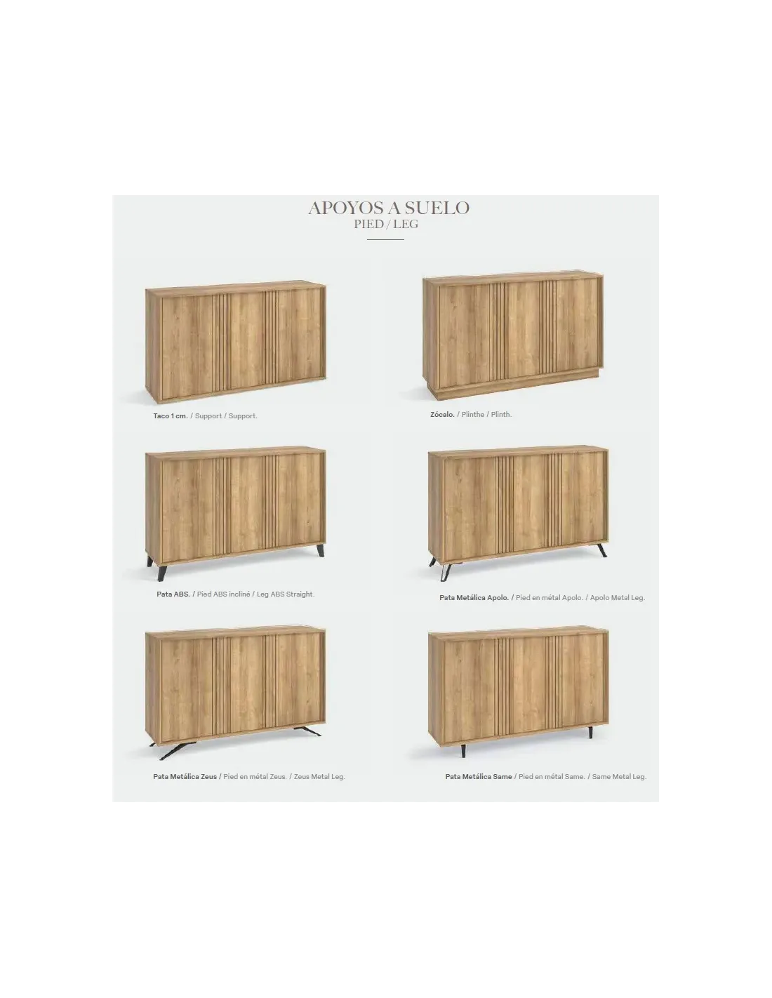 - Apoyos a suelo: variedad como los tacos para apoyar directamente el mueble a suelo sin dañarlo, el zócalo de altura 9 cm. que puede ir a juego o combinado con el mueble, patas abs de 12 cm. o las patas metálicas de 12 o 15 cm. (siempre en negro).