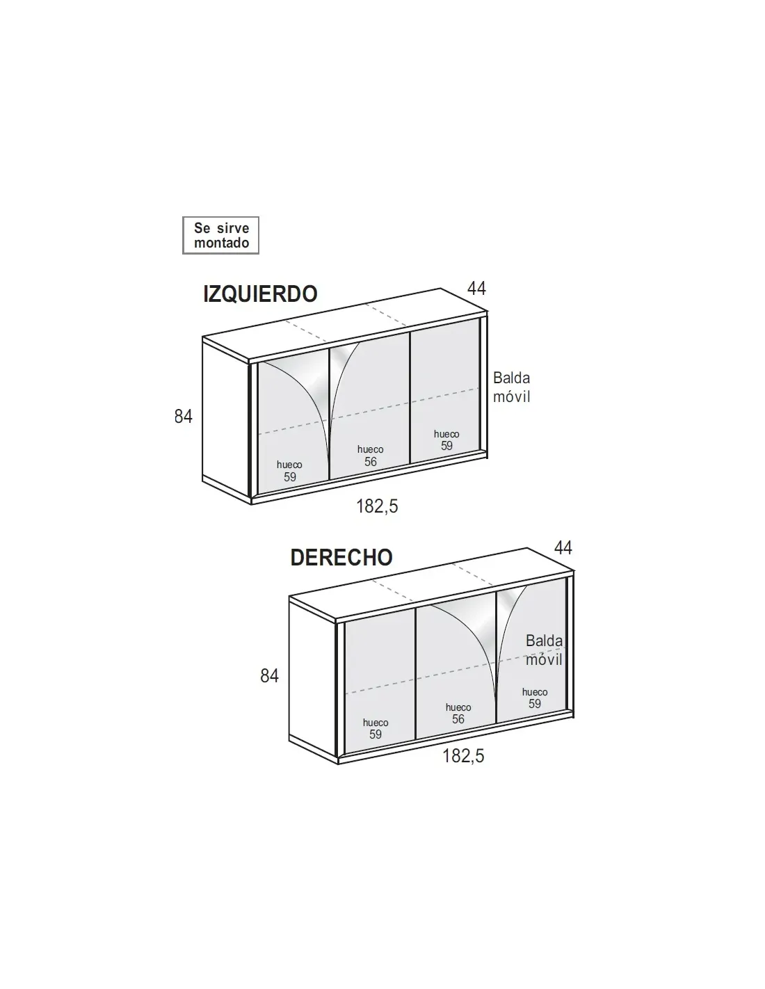 Todas las vitrinas y cuerpos altos llevan incluidos en su dotación herraje para fijarlos a la pared. Es imprescindible su fijación a pared por motivos de seguridad.