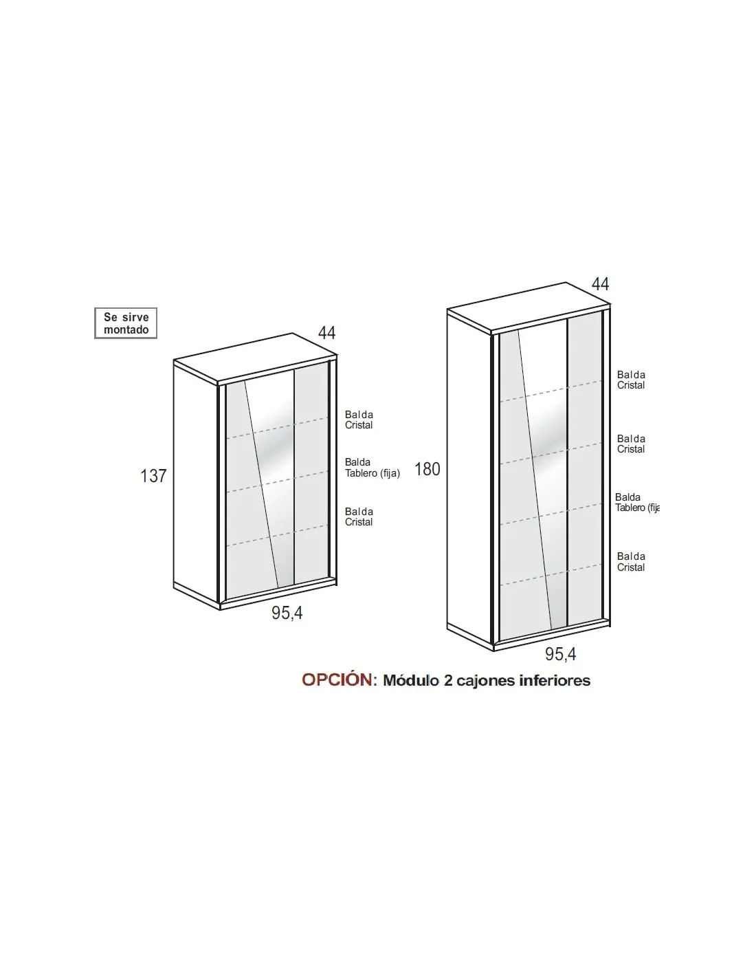 Este mueble vitrina 2P Diagonal viene con un medida de largo 95,4 cm.