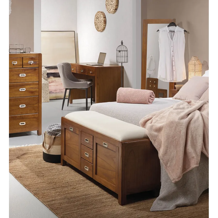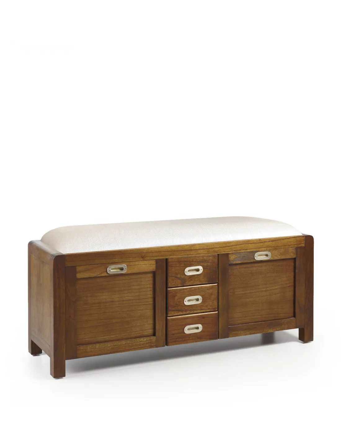 Banco zapatero fabricada en madera maciza de Mindi con inconfundible diseño colonial con cajones y puertas