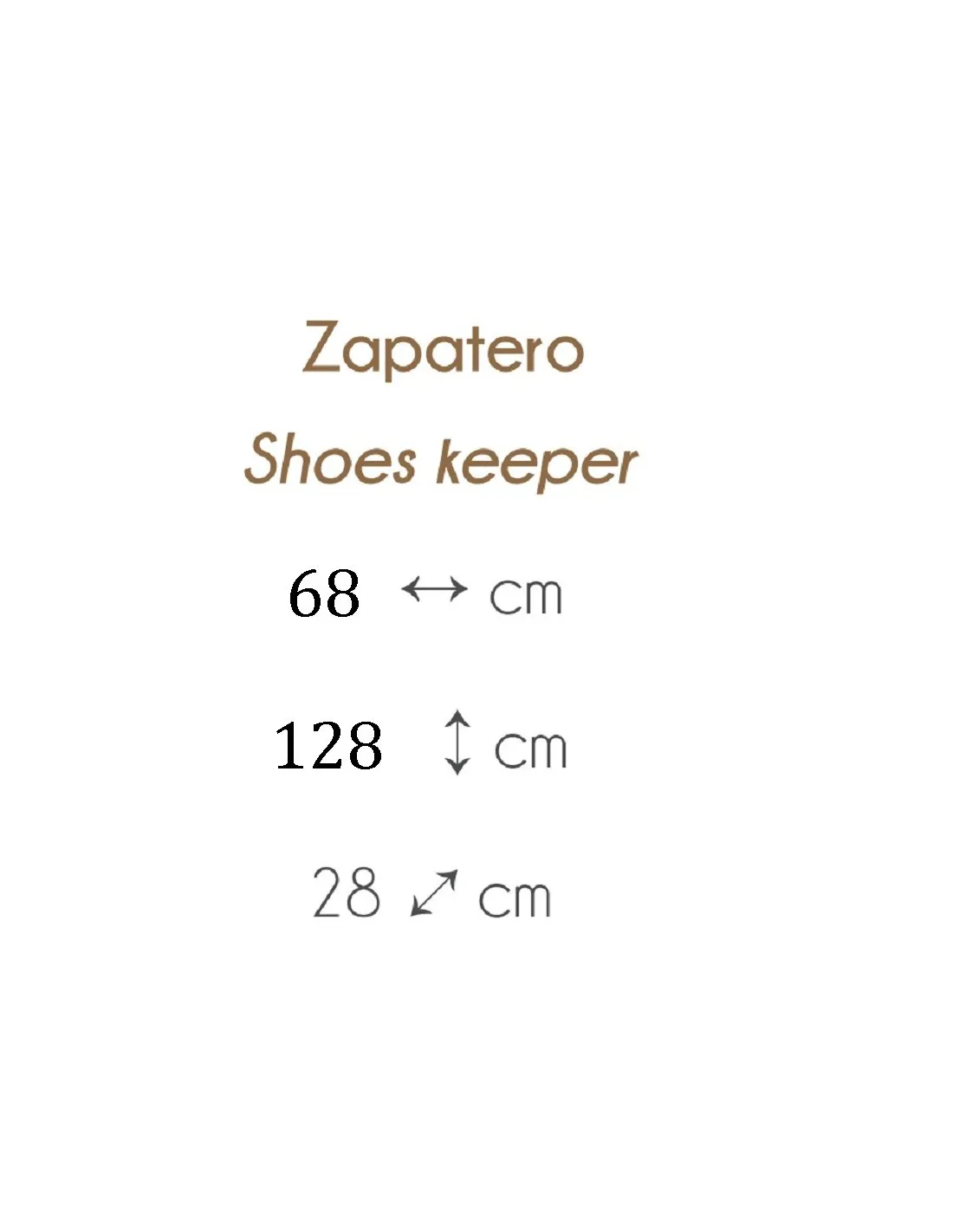 Esta zapatero esta fabricado en melamina de primera calidad con canteado de pvc a juego. Cuenta con herrajes metálicos y dos puertas abatibles con 6 estantes móviles que dan lugar a 7 huecos totalmente diáfanos. Tiene patas de acabado aluminio.