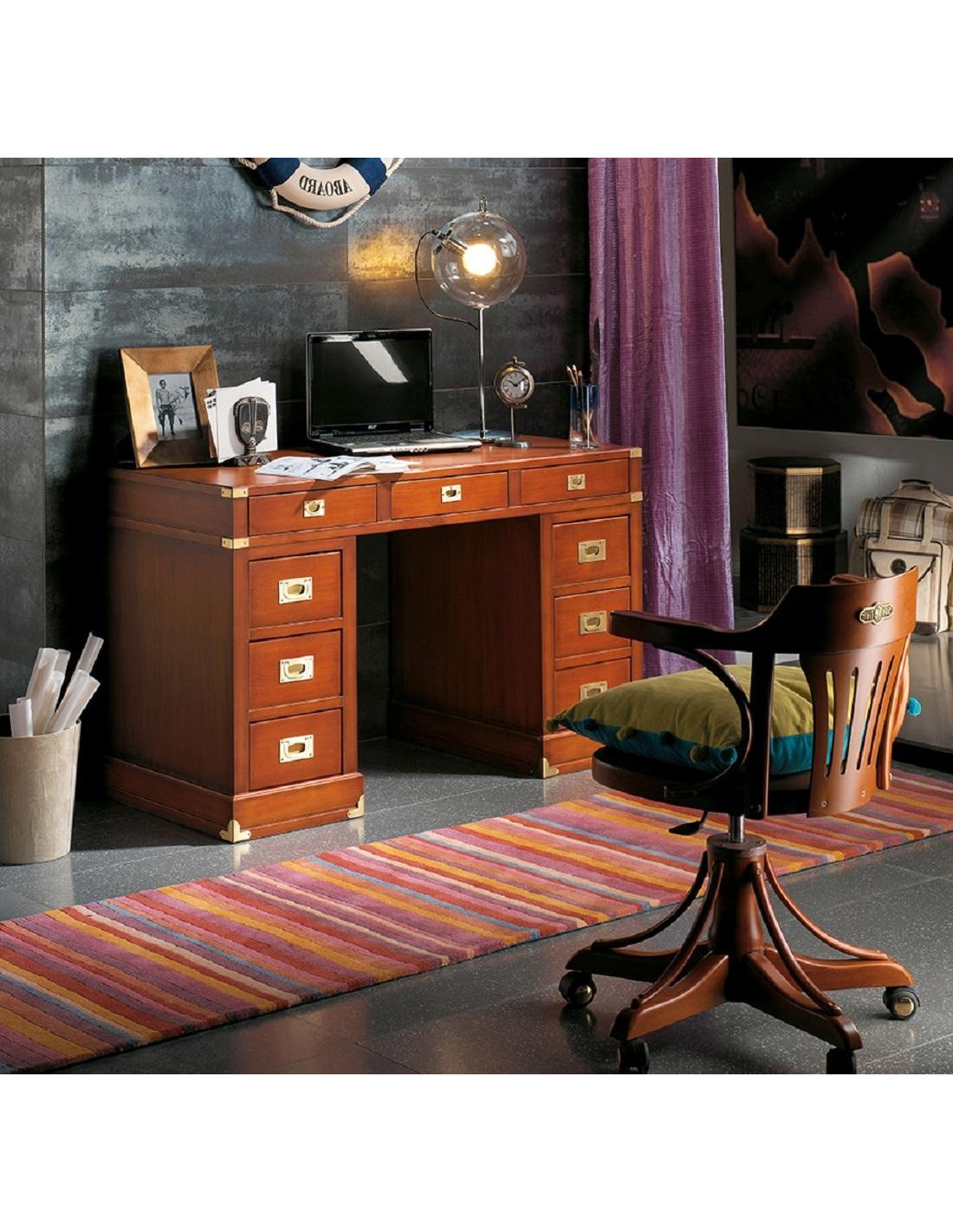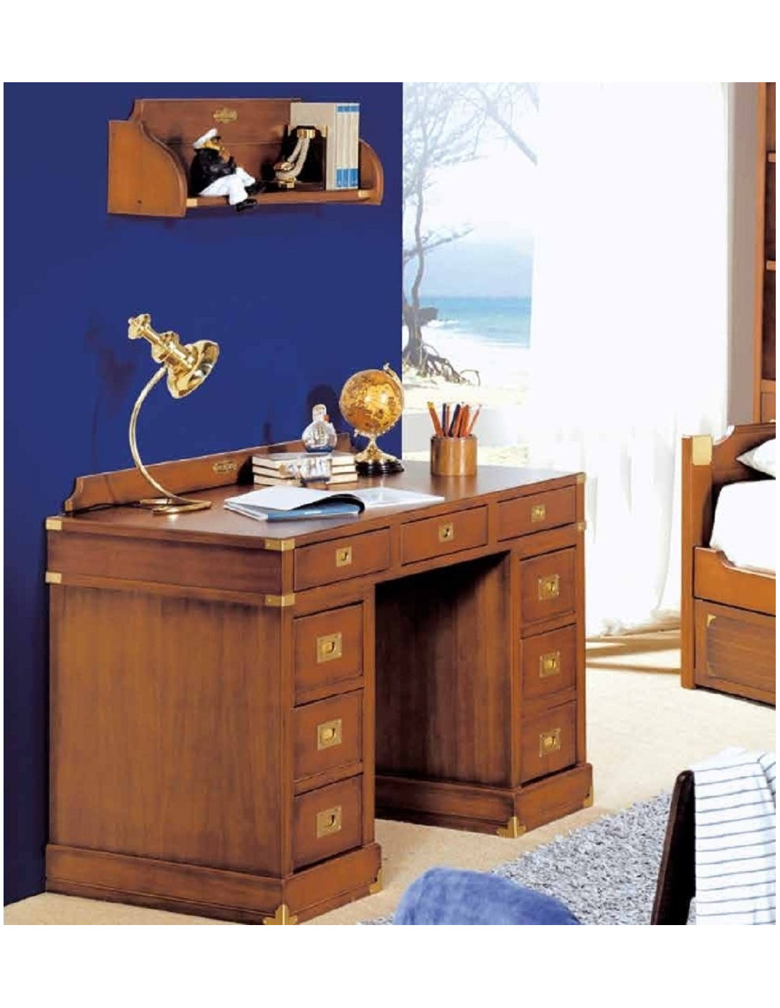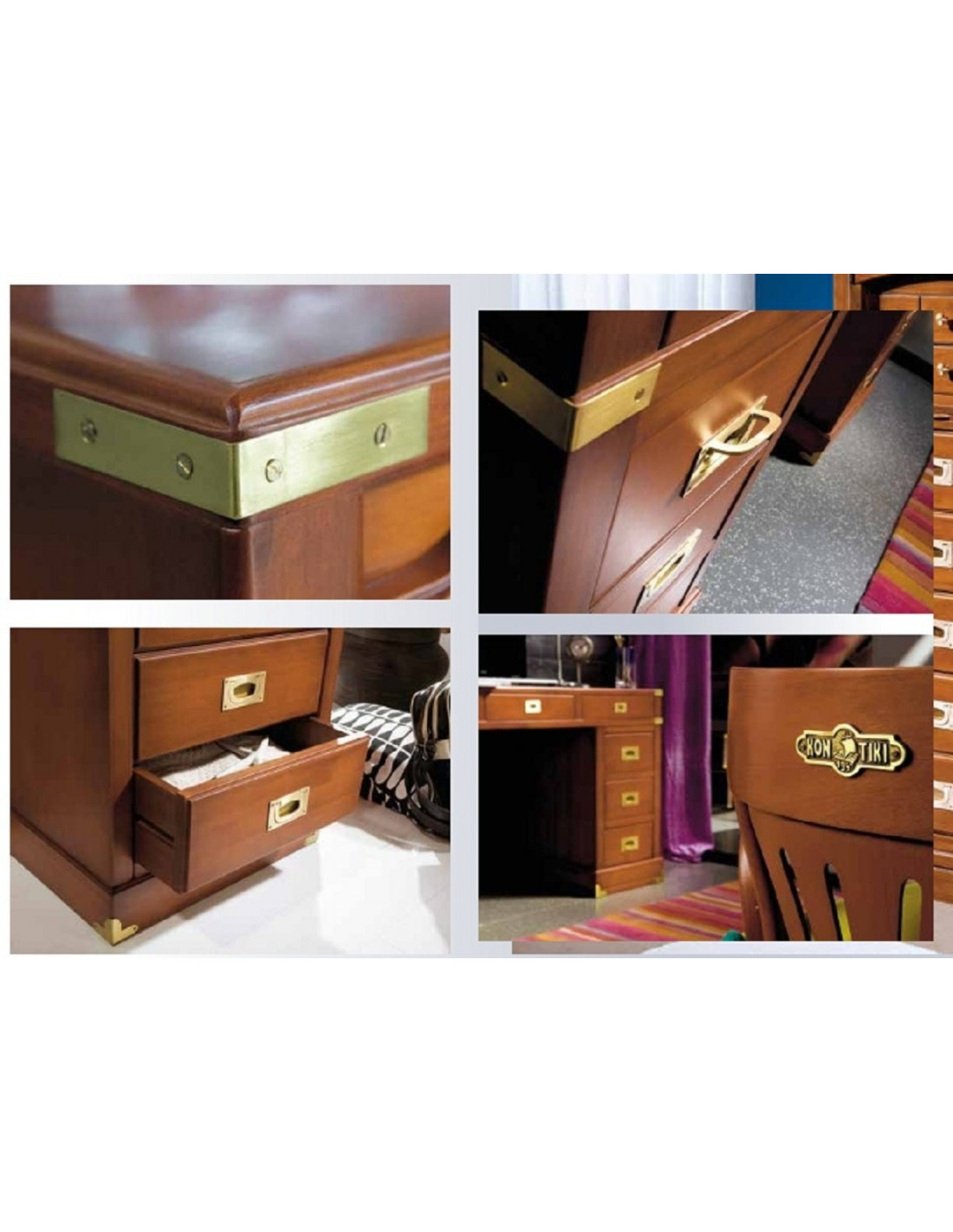 Esta mesa escritorio colonial tiene unos acabados pulimentados y barnizados de primera calidad, con la posibilidad de elegir entre blanco decapado, nogal claro y nogal naútico, con los detalles del mueble y herrajes de latón pulido.