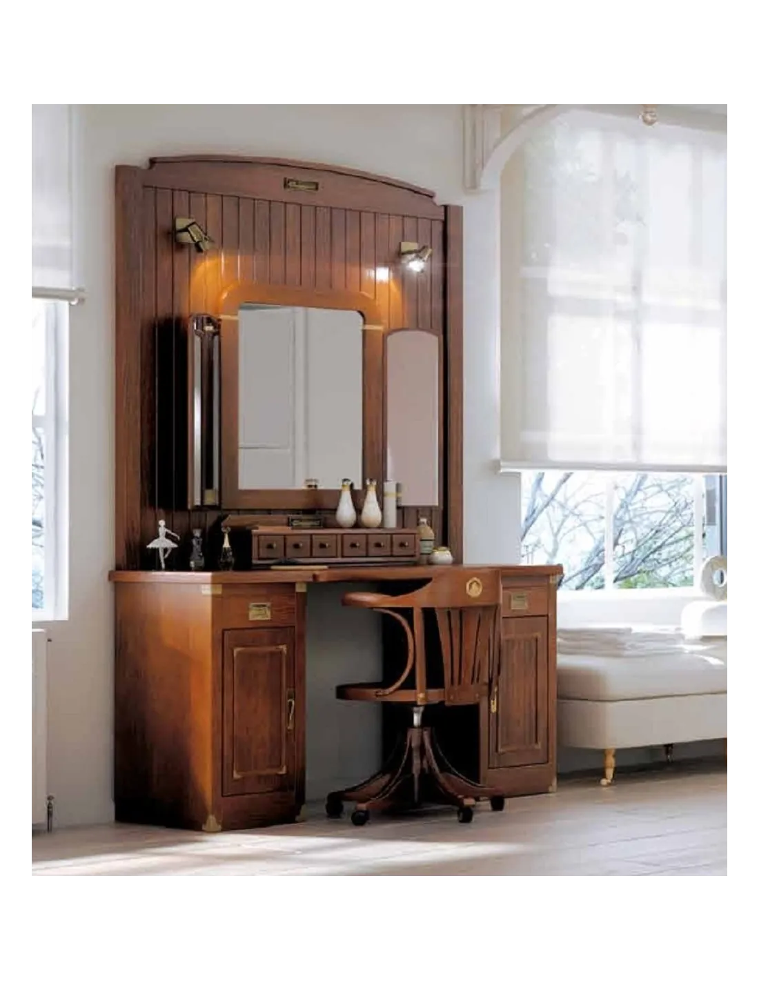 Esta mesa tocador Camarote tiene unos acabados pulimentados y barnizados de primera calidad, con la posibilidad de elegir entre blanco decapado, nogal claro y nogal naútico, con los detalles del mueble y herrajes de latón pulido.