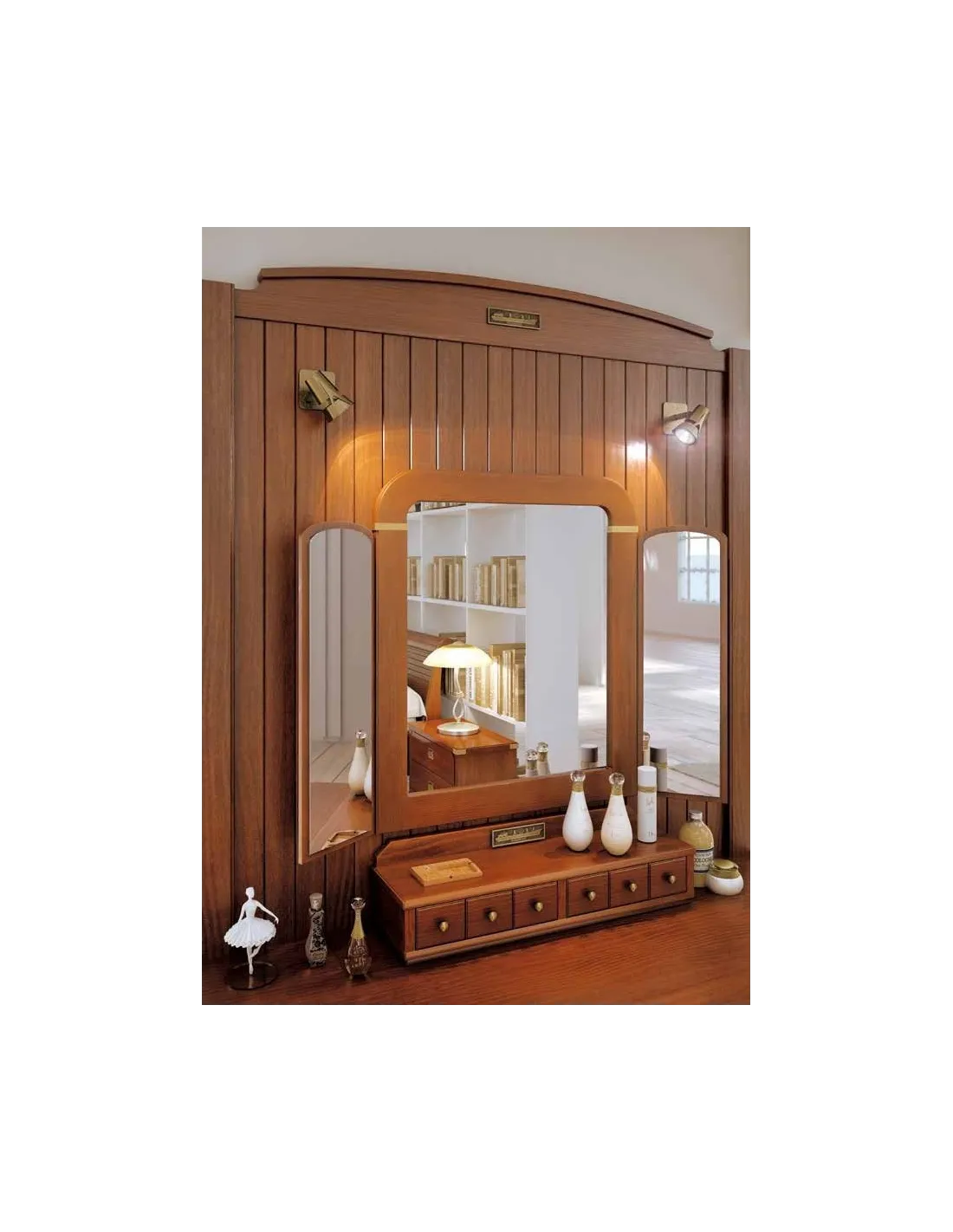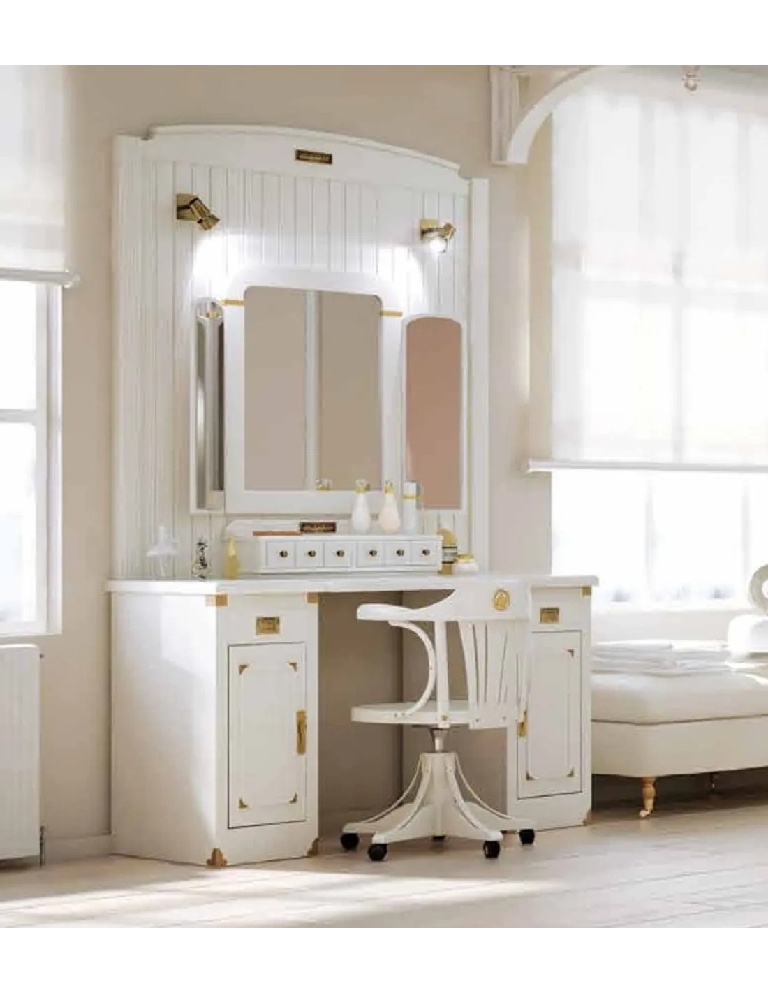 Puede optar por escoger el tocador tal y como está en esta composición o prescindir de alguno de sus elementos, que son los que se detallan a continuación: tríptico de espejo, apliques de luz, trasera de pared, secreter y mesa tocador con puertas. Puede mandarnos un mensaje para mandarle un presupuesto personalizado. La silla que acompaña a la composición también está disponible para pedido.