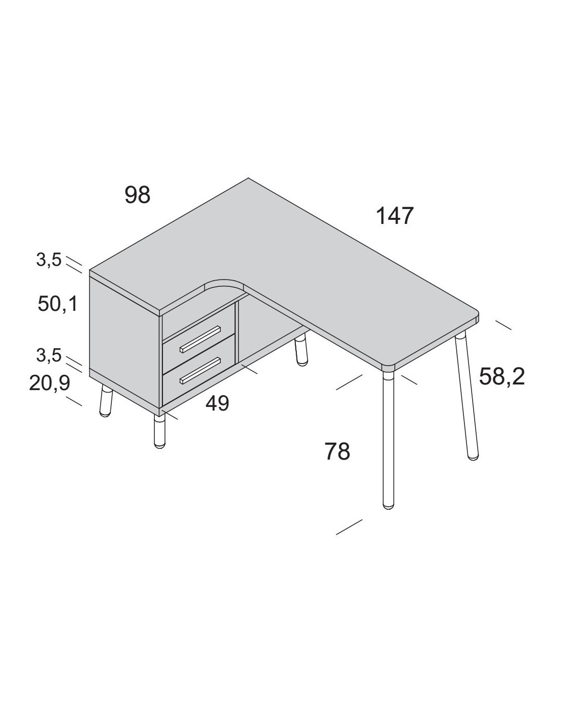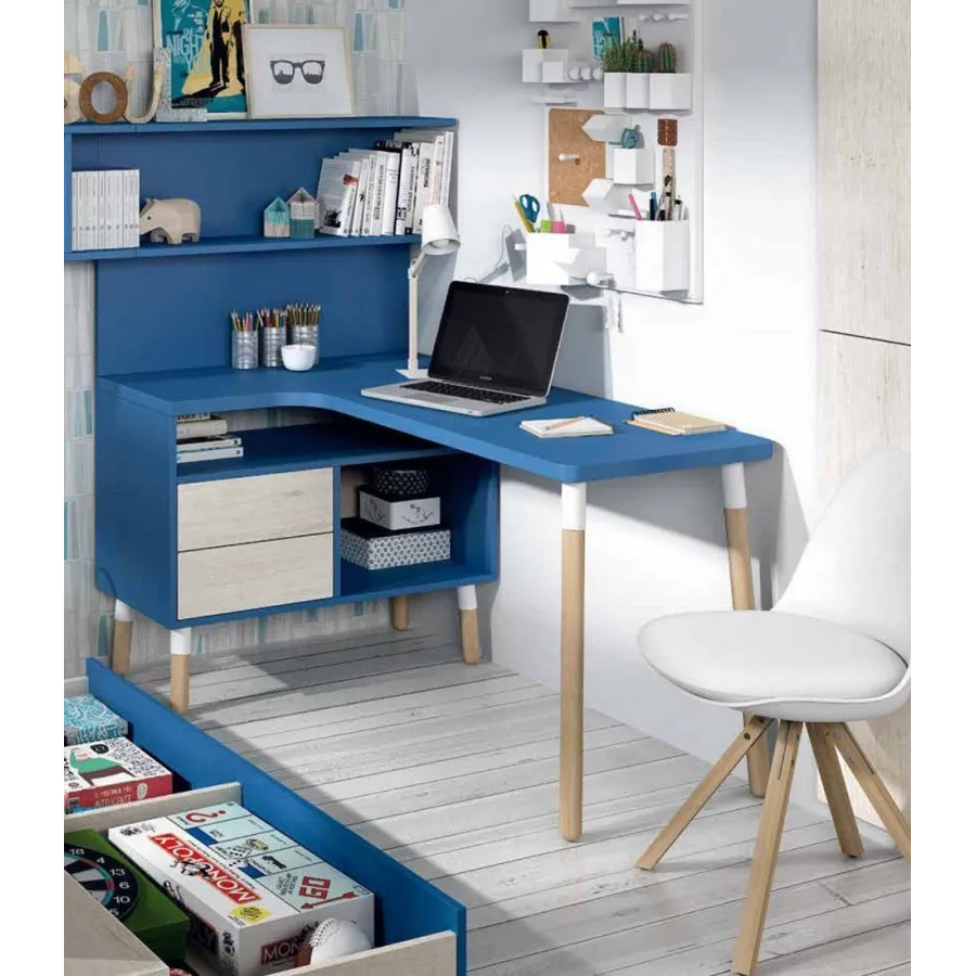 Este escritorio juvenil con tapa en forma de L, incluye la cajonera con huecos de estantería que hace de pata. cajonera y patas de madera natural presenta las siguientes medidas totales: