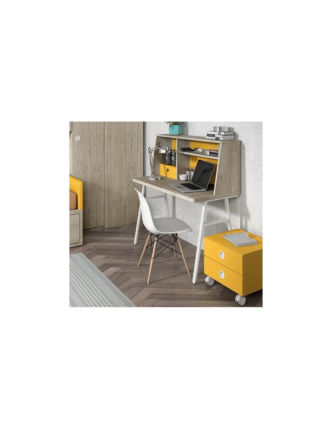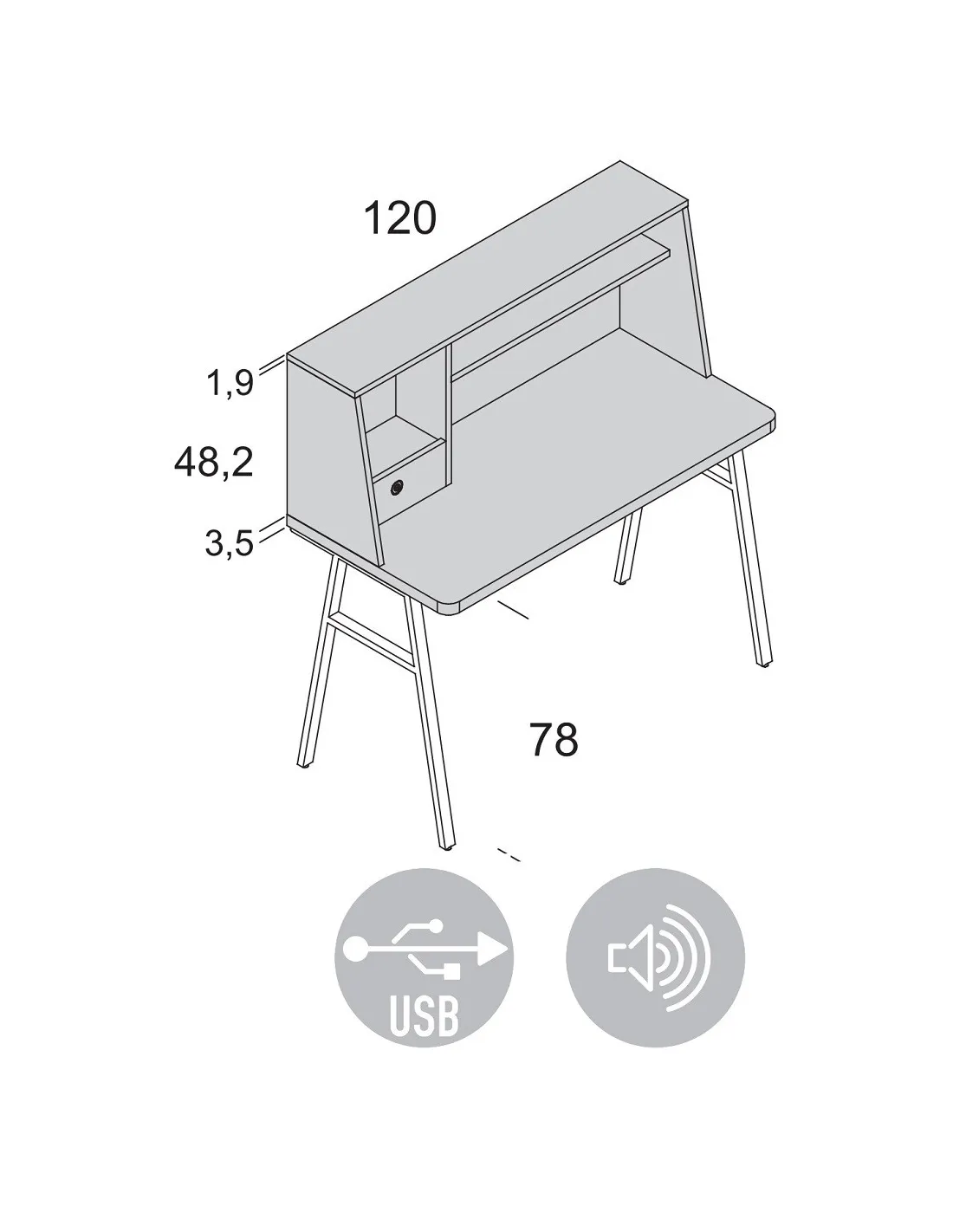Este escritorio juvenil se compone de la tapa, que incorpora una serie de huecos y estanterías y un pequeño cajón que alberga el dispositivo de carga USB, dispuesta sobre unas patas metálicas. Tiene las siguientes medidas: