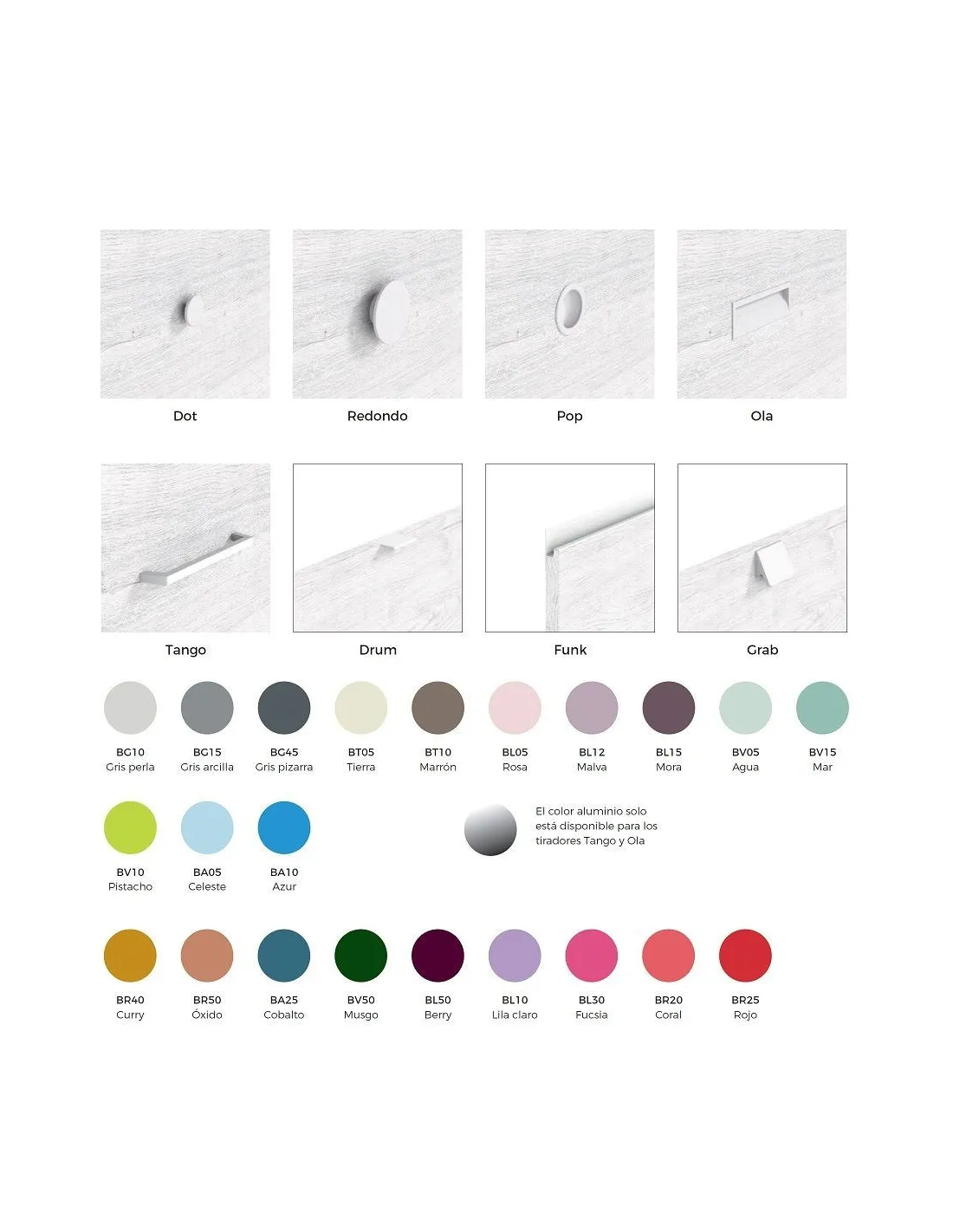 Se pueden combinar más de dos colores (uno distinto para la tapa del escritorio y para las traseras) y escoger otros modelos de tirador. Para esto, debe dirigirse, más arriba, a la pestaña "Personalización de producto" y responder a las preguntas con sus preferencias de colores (sin coste adicional).